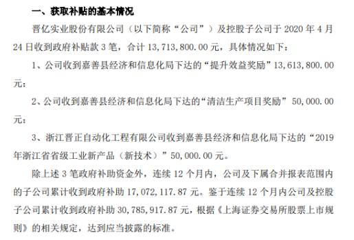 近日,晋亿实业发公告称,晋亿实业股份有限公司及控股子公司于2020年4月24日收到政府补贴款3笔,合计13,713,800.00元,具体情况如下: