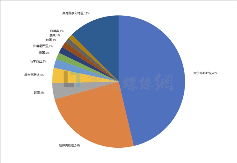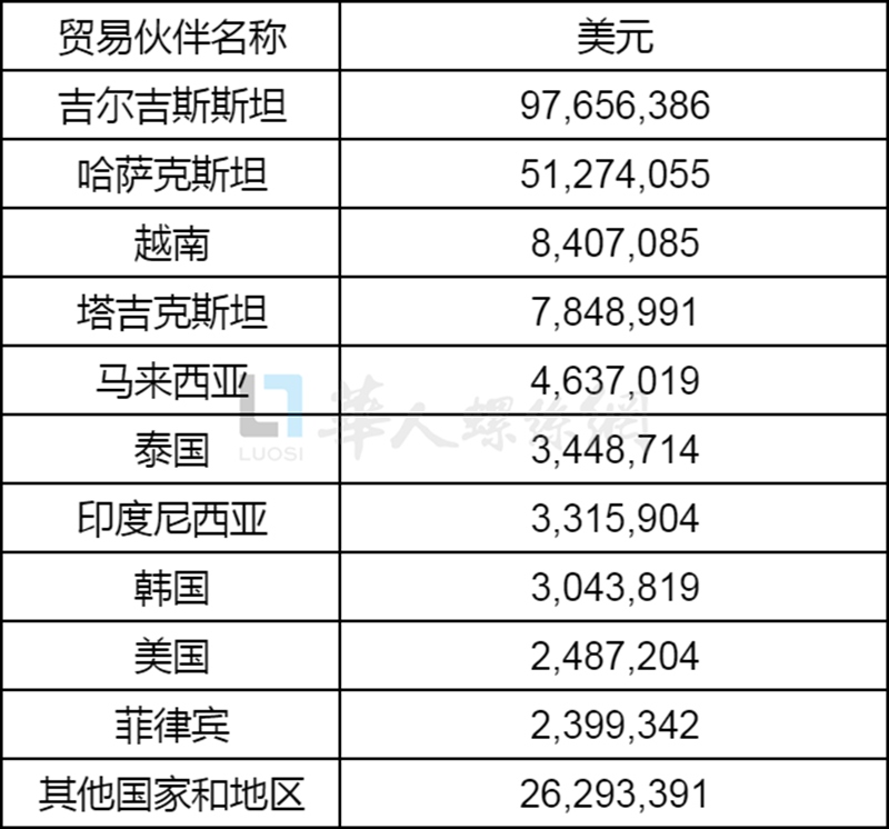 2025年前三季度,新疆自治区紧固件出口金额突破了2亿美元,超越了福建、天津以及广西三个沿海省份。在出口目的国家中,中亚地区的吉尔吉斯斯坦和哈萨克斯坦以97.66百万美元和51.27百万美元,占总出口额的70%以上。