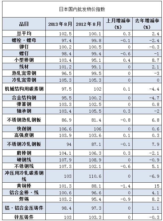 据金属产业新闻社最新数据统计: 2013年8月,日本国内批发物价指数为102.5,去年同期为100.1,相比增长2.4%,环比增长0.3%。 出口物价指数为106.0,去年同期为94.1,同比增长12.6%,环比下降1.2%;进口物价指数为121.8,去年同期为103.6,同比增长17.6%,环比下降1.0%。