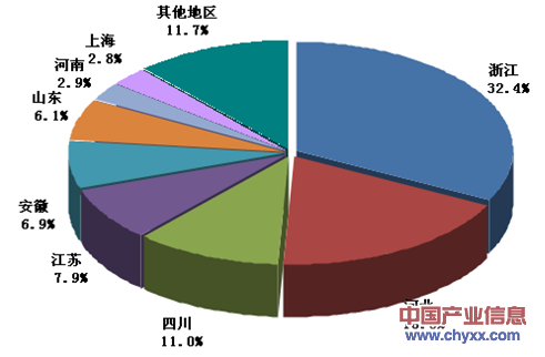 数据显示,2013年1-12月我国金属固件行业产量达到639万吨,产量居前三位的省份为浙江省222,468.37吨、河北省42,307.73吨、四川省60,599.33台,分别占金属固件行业全国总产量比重为32.4%、18.5%、11%,三地合计占全国比重为61.9%,产量集中度较高。