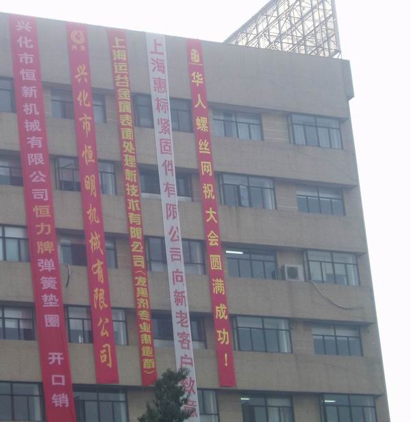 宝山宾馆外彩旗飘飘,各大厂商挂的横幅几乎将宾馆外墙遮盖,“华人螺丝网祝大会圆满成功”的横幅醒目的放在右侧第一位。